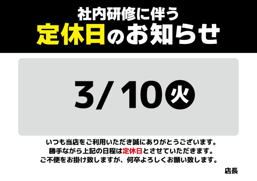 【定休日のご案内】3月10日(火) は社内研修のため全店休業させていただきます