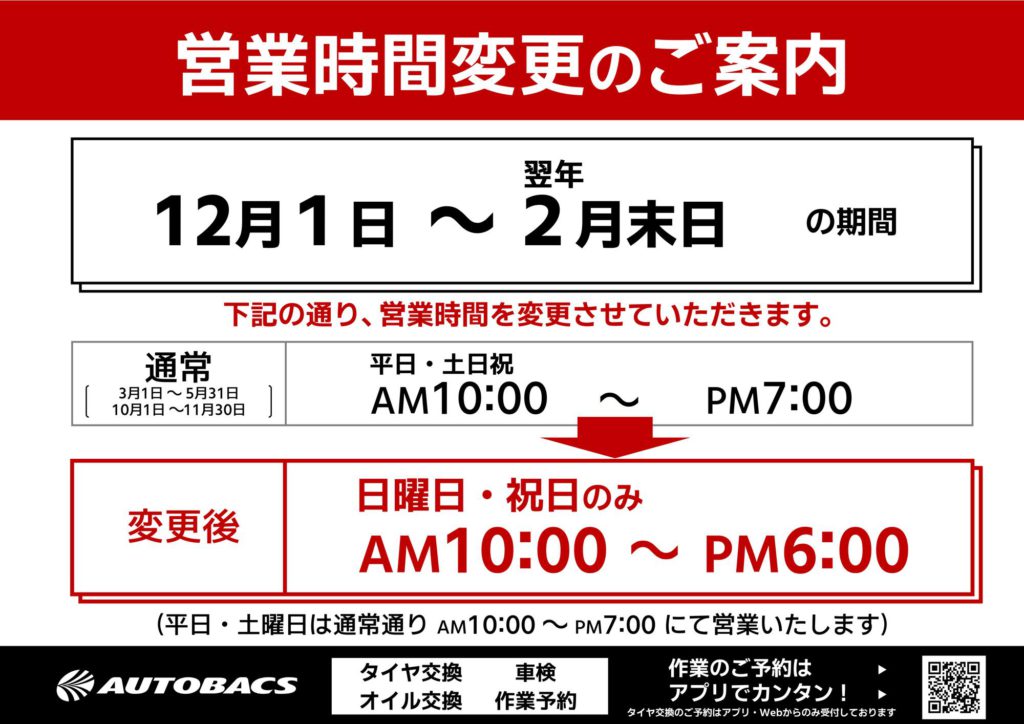 【12月以降の日祝営業時間変更のお知らせ】