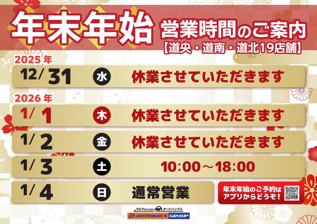 | 【道央・道南・道北19店舗】 平岡店・苫小牧店・西岡店・新札幌・江別店 岩見沢店・札幌白石・環状通光星店・石山通店 札幌北47条店・スーパーオートバックス札幌 千歳豊里店・花咲店・スーパーオートバックス函館 旭川豊岡・小樽店・石狩花川・恵庭店・月寒店 |