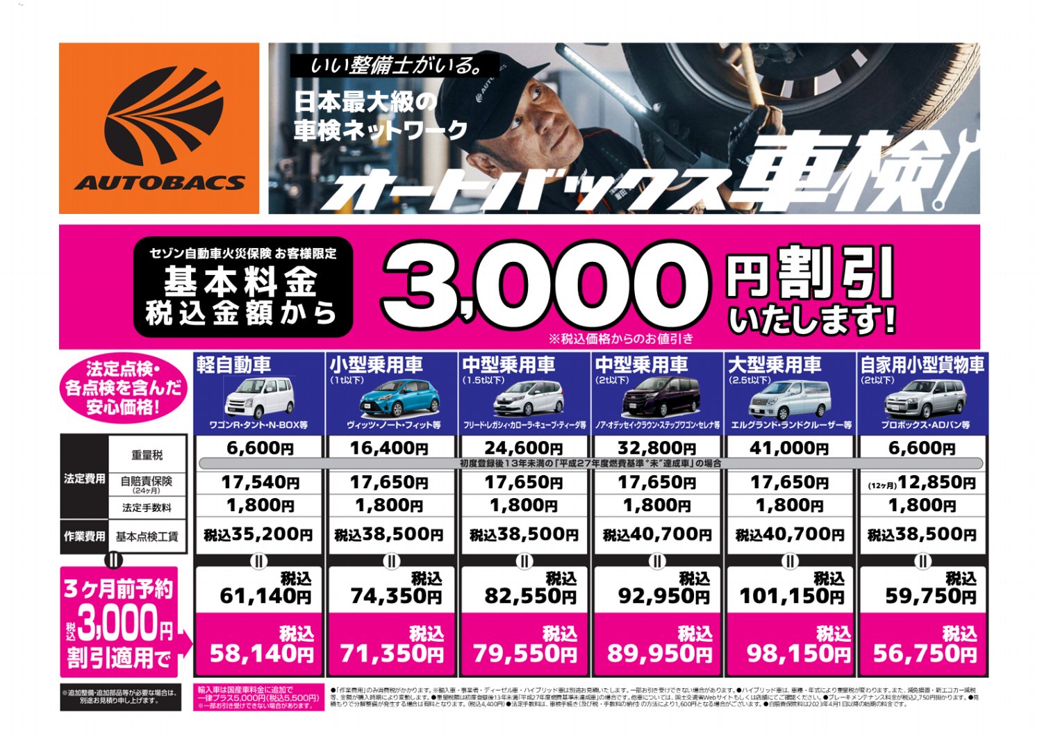 ・稚内店 料金表 注)追加整備・追加部品等が必要な場合は、別途お見積り申し上げます。 ※輸入車・ 事業車・ディーゼル車・ハイブリツド車は別途お見積り致します。一部お引受けできない場合があります。 ※輸入車、改造車等一部お受けできない場合があります。 ※ハイブリッド車は、車種・年式により重量税が変わります。また、減免措置・新エコカー全税等、金額が購入時期により変動します。 ※重量税額は、初度登録後13年未満「平成27年度燃費基準未達成車」の場合です。 他車については、国土交通省Webサイトもしくは当店にてご確認ください。 ※上記料金は2023年12月現在のものです。 車検事前見積り・車検予約については、店舗までお気軽にお問い合わせください。 オートバックス・稚内店 TEL:0162-33-5585 【 周辺地図 】