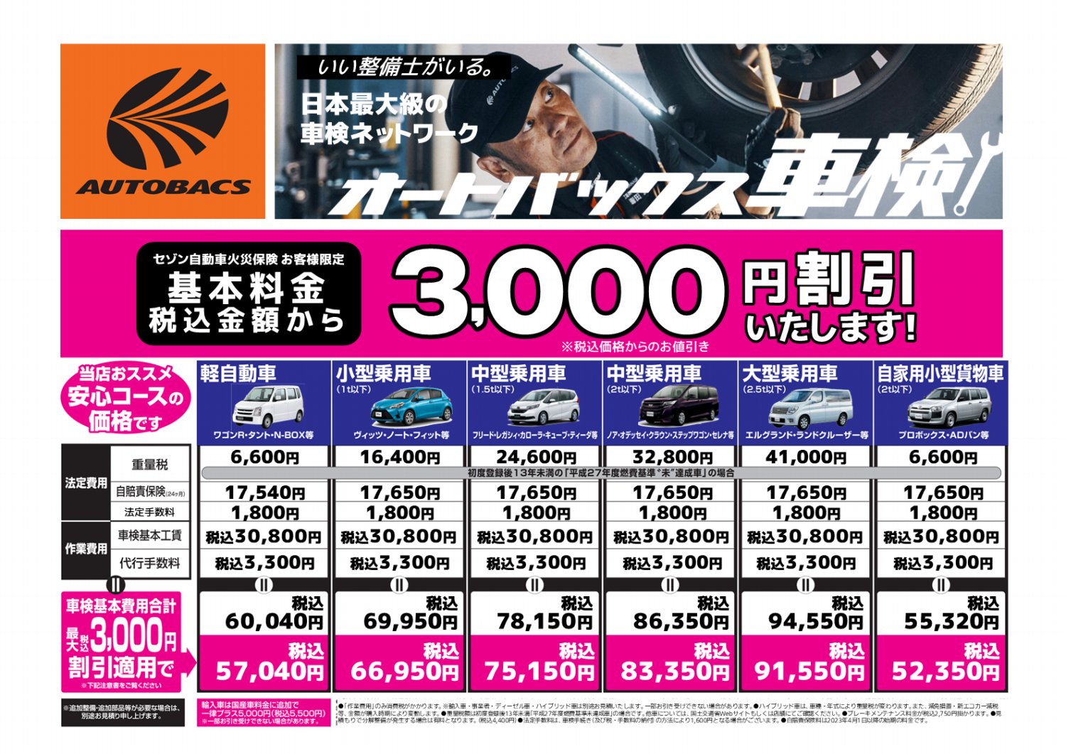 静内 料金表 注)追加整備・追加部品等が必要な場合は、別途お見積り申し上げます。 ※輸入車・ 事業車・ディーゼル車・ハイブリツド車は別途お見積り致します。一部お引受けできない場合があります。 ※輸入車、改造車等一部お受けできない場合があります。 ※ハイブリッド車は、車種・年式により重量税が変わります。また、減免措置・新エコカー全税等、金額が購入時期により変動します。 ※重量税額は、初度登録後13年未満「平成27年度燃費基準未達成車」の場合です。 他車については、国土交通省Webサイトもしくは当店にてご確認ください。 ※上記料金は2023年12月現在のものです。 車検事前見積り・車検予約については、店舗までお気軽にお問い合わせください。 オートバックス静内 TEL:0146-45-1000 【 周辺地図 】 一覧へ戻る