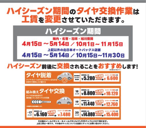 10月15日よりハイシーズンタイヤ交換料金のお知らせ