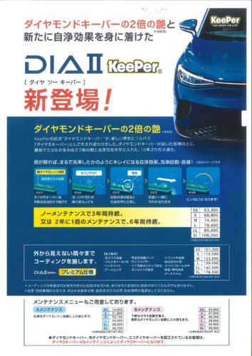 【ダイヤ2キーパー】は従来のダイヤモンドキーパーの2倍の艶!! 雨が降れば洗車したかのようにキレイになる自浄効果があります!! なので洗車回数が減ります。楽してキレイ!! ノーメンテナンスで3年間持続。又は2年に1回のメンテナンスで6年間持続します。